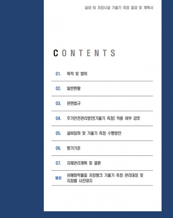 실내,외 저장시설 기울기 측정결과 및 계획서 케이피텍 2023-06-12 케이피텍 0 311 2023.06.12 15:27 2023.06.12 15:29 실내·외 저장시설 기울기 측정 결과 및 계획서.pdf (992.0K) + 6 사업장의 유해화학물질을 취급하는 ‘기존시설(2014년 12월 31일 이전 착공 시설)’ 검사항목 중 ‘유해화학물질 저장설비의 지반조사, 기초공사 및 고정조치’에 대한 기초자료가 부족하여 취급 시설 검사 수행 시 ‘서면자료를 준비하는데 많은 어려움이 있어 이에 추가안전관리방안으로써 ’기울기 측정 및 주기적인 관리‘를 통해 이를 대체하고자 하여 만들어진 계획서 입니다. 필요하신분은 첨부파일 확인하시기 바랍니다.