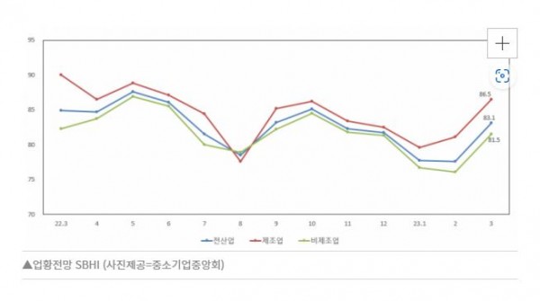중소기업중앙회가 27일 발표한 ‘2023년 3월 중소기업경기전망조사’에 따르면, 3월 업황전망 경기전망지수(SBHI)는 83.1로 전월 대비 5.5포인트(p) 상승했다. 지난해 같은 기간 대비 1.8p 하락했으나, 지난해 10월(85.1) 이후 4개월 연속 내림세에서 반등하며 80p대를 회복한 것이다. SBHI는 100 이상이면 긍정적으로 응답한 업체가 많음을 나타내며, 100 미만이면 그 반대를 뜻한다.