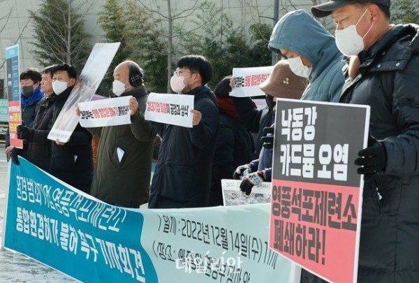 환경운동연합, 영풍제련소 주변 환경오염 및 주민건강피해 공동대책위원회 관계자들이 지난 14일 정부세종청사 환경부 앞에서 영풍 석포제련소에 대한 '통합환경허가' 불허 및 폐쇄를 촉구하는 기자회견을 하고 있다. ⓒ연합뉴스