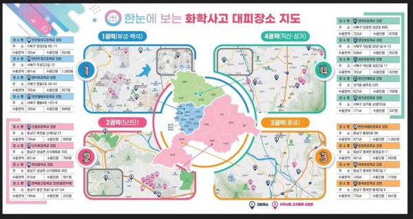 화학사고 대피장소 안내지도는 권역별로 대피장소를 나타내고 화학사고