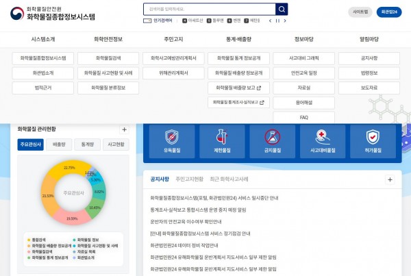 화학사고 대응기관 및 국민에게 제공하는 화학물질종합정보포털로, 화관법 민원처리를 온라인으로 편리하게