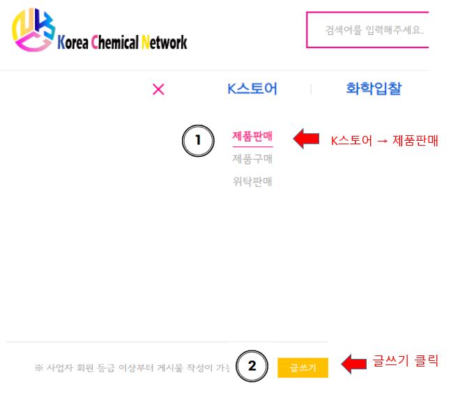 ① 코리아케미칼네트워크(코켐넷) 메인페이지 상단에 K스토어 → 제품판매 선택