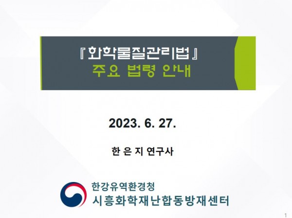 시흥상공회의소 화학안전설명회 교육자료(6.27) 케이피텍 2023-07-13 케이피텍 0 254 2023.07.13 13:00 2023.07.13 13:00 화학물질관리법 주요 이해- 한은지 연구사.pdf (3.0M) + 3 6월27일 시흥상공회의소 화학안전설명회 교육자료 첨부합니다. '화학물질관리법'주요 법령 안내