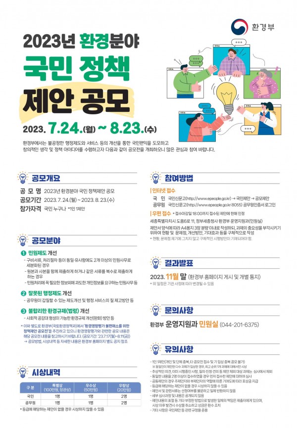 2023년 환경분야 국민정책 제안 공모 (7.24~8.23) 케이피텍 2023-07-26 케이피텍 0 239 2023.07.26 15:45 환경부에서는 불공정한 행정제도와 서비스등의 개선을 통한 국민 편익을 도모하고 창의적인 생각 및 정책 아이디어를 수렴하고자 다음과 같이 공모전을 개최하오니 많은 관심과 참여 바랍니다.