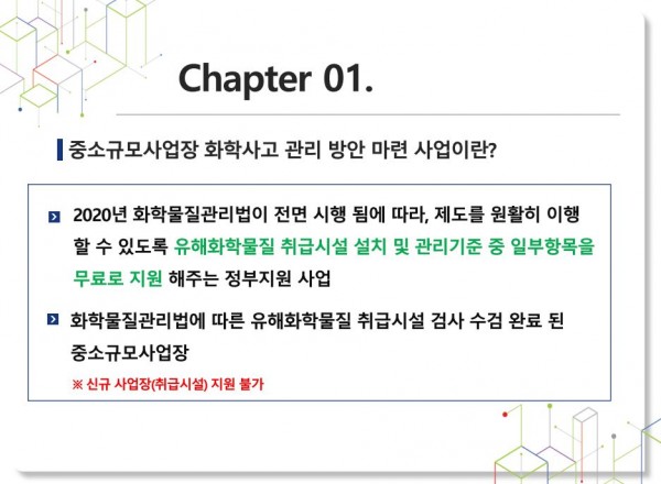 중소규모사업장 화학사고 예방관리 방안 사업 안내 케이피텍 2023-07-27 케이피텍 0 277 2023.07.27 16:23 2023.07.27 16:23 중소규모사업장 화학사고 예방관리 방안 사업 안내.pdf (1.9M) + 3 시흥상공회의소 6월27일 화학안전설명회 교육자료입니다. 첨부파일 참고하시기 바랍니다.