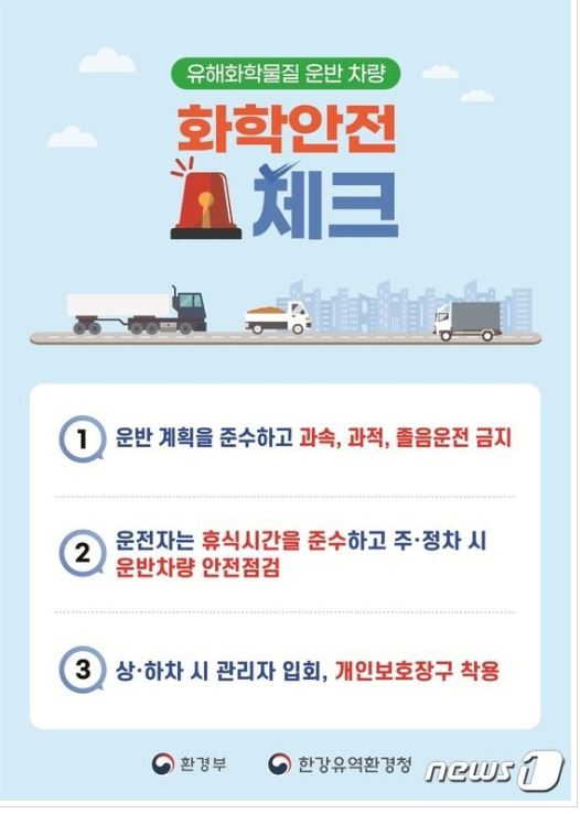 한강유역환경청이 최근 사고 비중이 커지고 있는 화학물질 운송차량 사고 예방을 위해 6월부터 8월까지 화학안전 홍보캠페인을 펼친다.