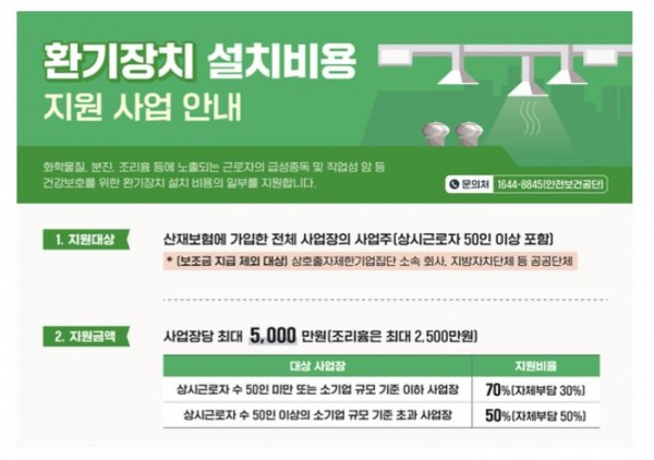 이번 환기장치 지원사업은 2022년 발생한 세척공정 집단 급성중독과 단체 급식시설에서의 폐암 등의 사례가 공통적으로 환기시설의 부재 또는 성능 부족으로 인해 발생한 것으로 나타났기 때문에 마련됐다.