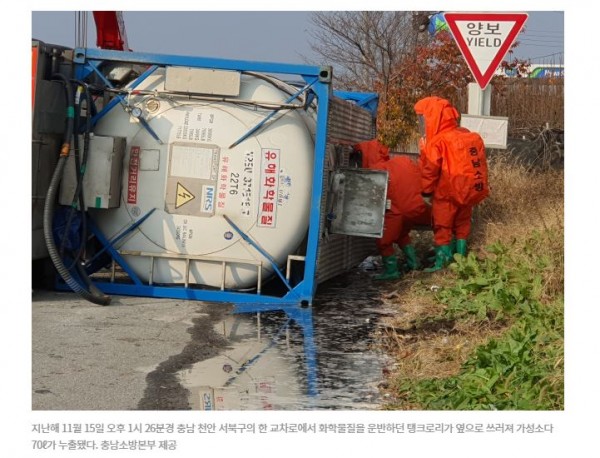 26분경 충남 천안 서북구의 한 교차로에서 화학물질을 운반하던 탱크로리가 옆으로 쓰러져 가성소다 70ℓ가 누출됐다. 충남소방본부 제공