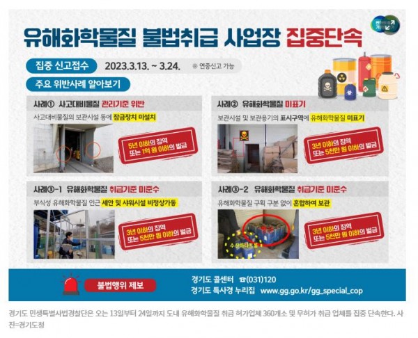 경기도 민생특별사법경찰단은 오는 13일부터 24일까지 도내 유해화학물질 취급 허가업체 360개소 및 무허가 취급 업체를 집중 단속한다고 7일 밝혔다.